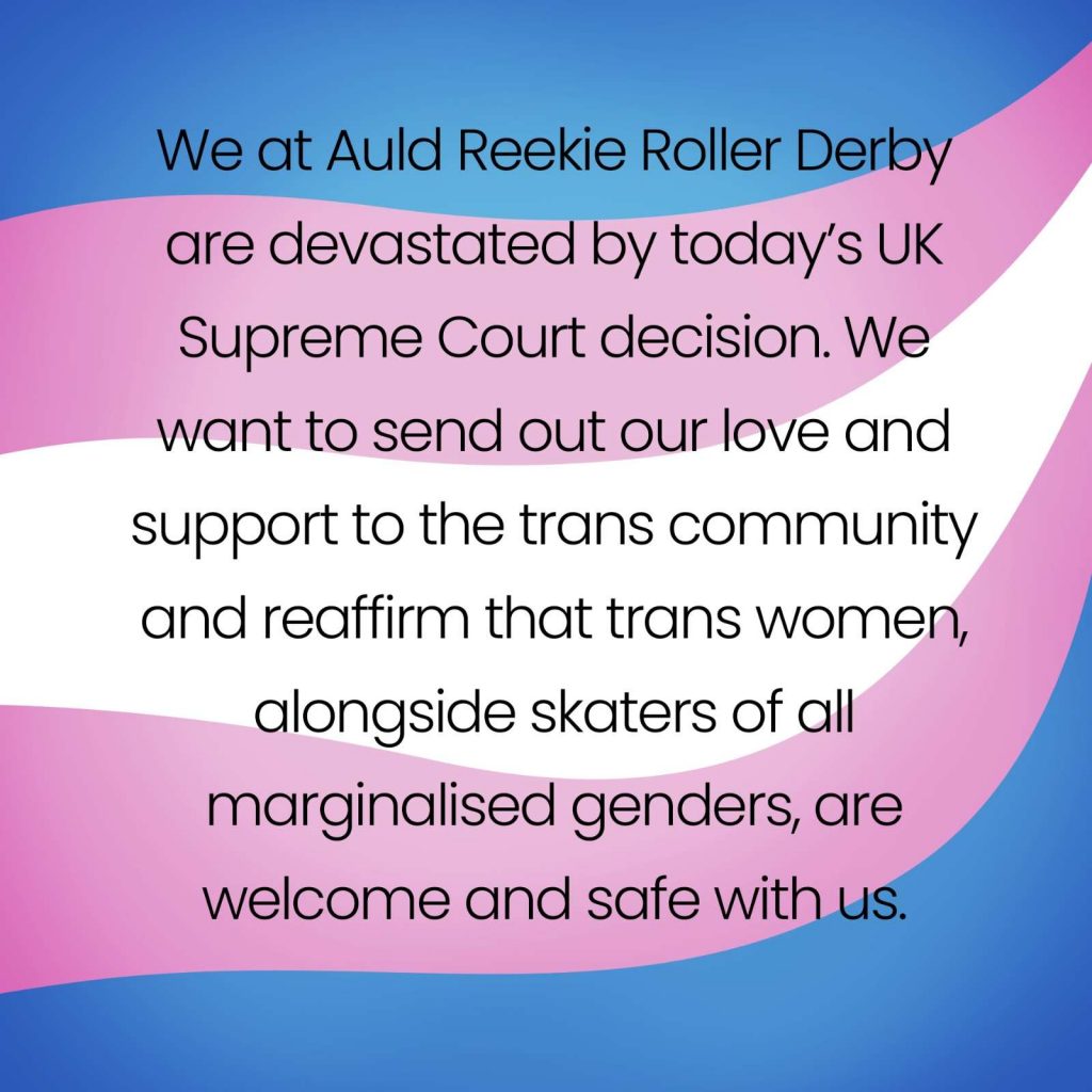 We at Auld Reekie Roller Derby are devastated by today’s UK Supreme Court decision. We want to send out our love and support to the trans community and reaffirm that trans women, alongside skaters of all marginalised genders, are welcome and safe with us.